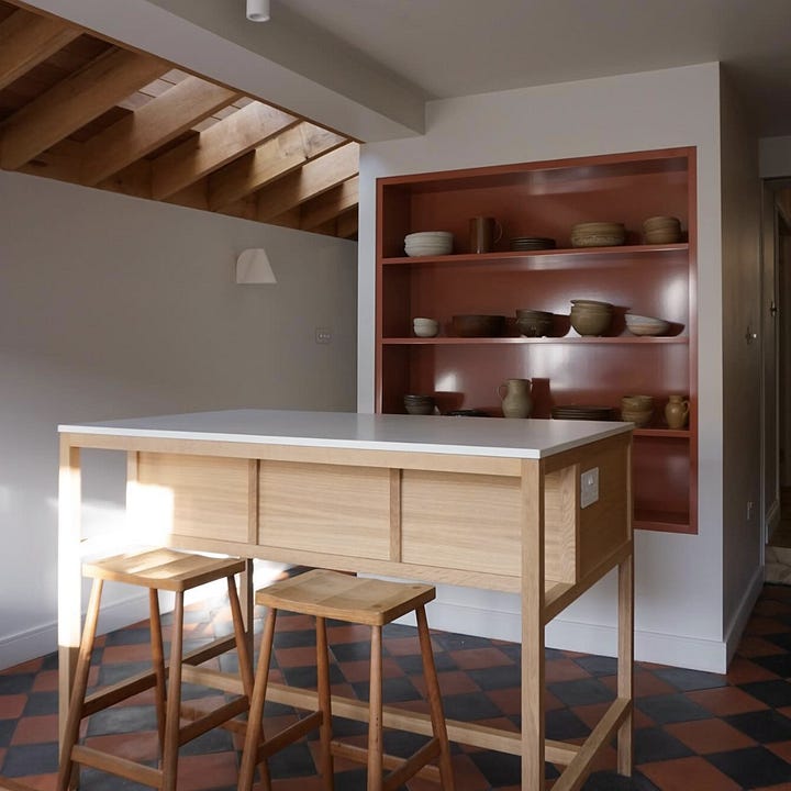 Recently, I spotted two different kitchens using colorful paint to highlight simple open shelves. Above at left is a house in Sea Ranch that we considered renting and above at right is the London kitchen of interior architect Emily Pun. I love this colorblock effect and how easy it would be to copy if you have some shelves of your own. Has anyone seen this done elsewhere? I’m calling it a microtrend.