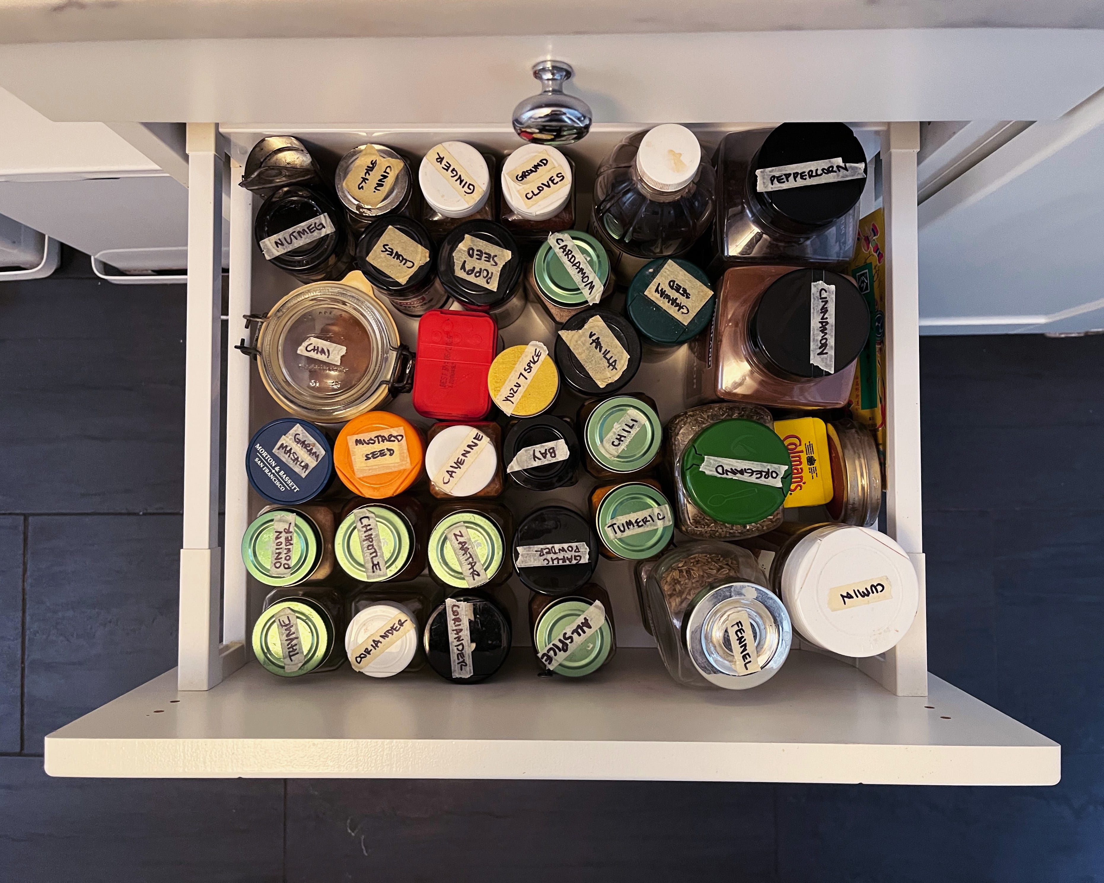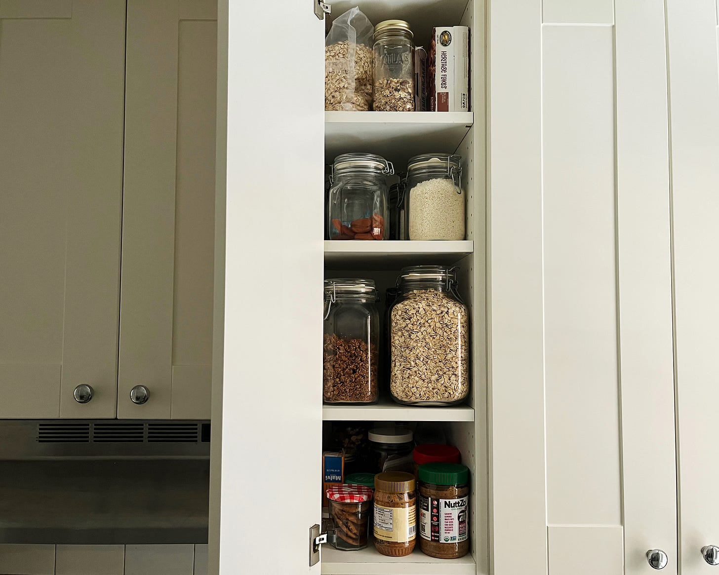My kitchen is a great example of striking the balance between being “organized” and totally laissez faire. If you open a cabinet door things are orderly, but nothing like a professional organizer’s Instagram page. I decant most of my pantry staples into clear glass jars, but they don’t all match. I’ve mostly banished the “junk” from our drawers. Some things are labeled but the labels are just strips of masking tape with Sharpie lettering. I’m organized-ish.