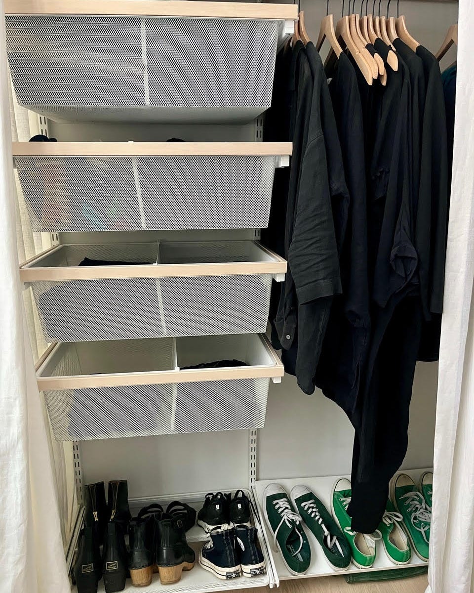 Alix, a reader of the Living Small newsletter, shared that she only wears black clothing (a true New Yorker flex), so I asked if she'd tell me about it. Previously, Alix had a wardrobe of all neutral, natural fiber clothes that could be mixed and matched, but she switched to all-black (also natural fibers) to simplify even further. “Having a singular color is actually really helpful,” she says. “I also think black can be dressed up a bit more easily, and practically speaking it doesn't get as dirty.”